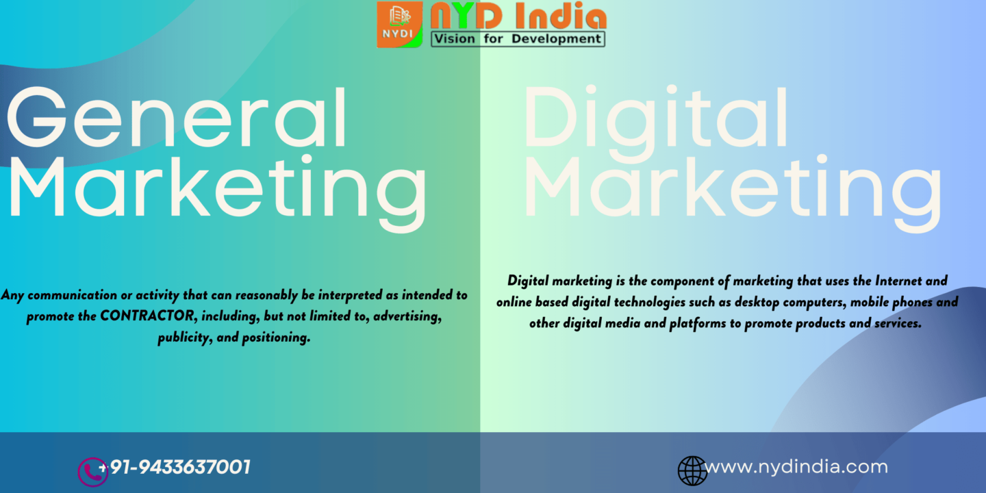Marketing is the process of promoting and selling products or services. General marketing is promoting products or services through traditional channels like radio, TV, print ads, billboards, and direct mail. Whereas digital marketing is promoting products or services through digital channels like email marketing, social media, search engines, and mobile apps.